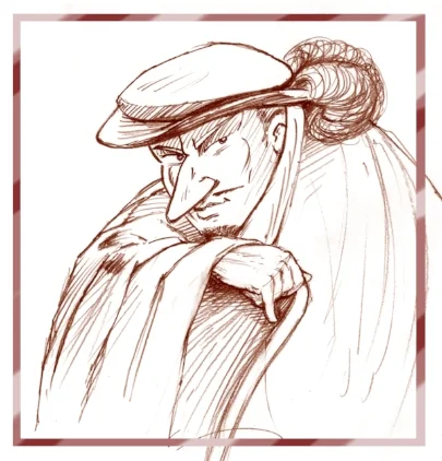 I have drawn him with his head at a jaunty angle to emphasise his rugged good looks. In fact, attractive people didn’t really come about until 1927, so he probably looked more like this…